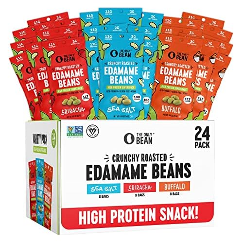 Super Hot! Get The Only Bean Crunchy Roasted Edamame - Healthy Snacks for Adults and Kids (Variety Pack), Low Calorie & Carb Keto Snack Food, Vegan Gluten Free High Protein Snacks (11g), Office Snack, 0.9oz 24 pack from Amazon.com (Sold by The Only Bean, Fulfilled by Amazon).
