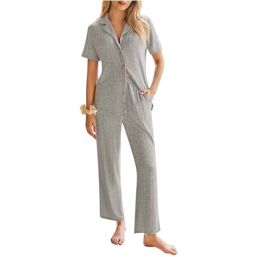 Get Ekouaer Women's Rib Knit Pajamas Button Up Lounge Sets Short Sleeve Top and Long Pants Matching Pjs Sleepwear Loungewear Light Grey Medium from Amazon.com (Sold by Ekouaer, Fulfilled by Amazon).